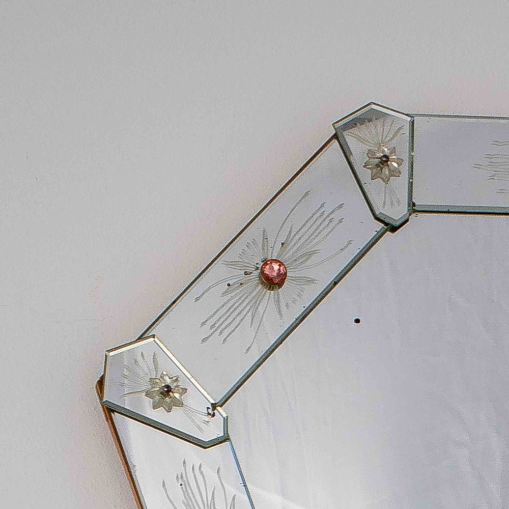 Dieser große venezianische Spiegel aus den 1950er Jahren ist vollverspiegelt und mit liebevollen gravierten Verzierungen und Details versehen. Er ist ein wunderschönes Kunstwerk: jede Seite einzigartig, jedes Detail sorgfältig bearbeitet und alle Geschichte und Persönlichkeit vereint. Dieser Spiegel wird jeden Raum in deinem Zuhause zu etwas ganz Besonderem machen.