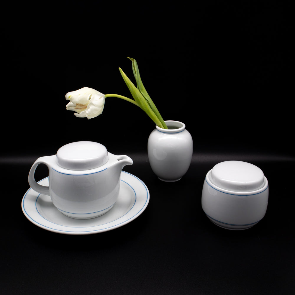 Das Frühstücksservice von Lilienporzellan besteht aus: zwei kleinen Kaffeekannen und Tellern, sowie einer Zuckerdose und Vase. Das Set gehört der Formserie Colomba an und wurde von Lilien Porzellan erzeugt.