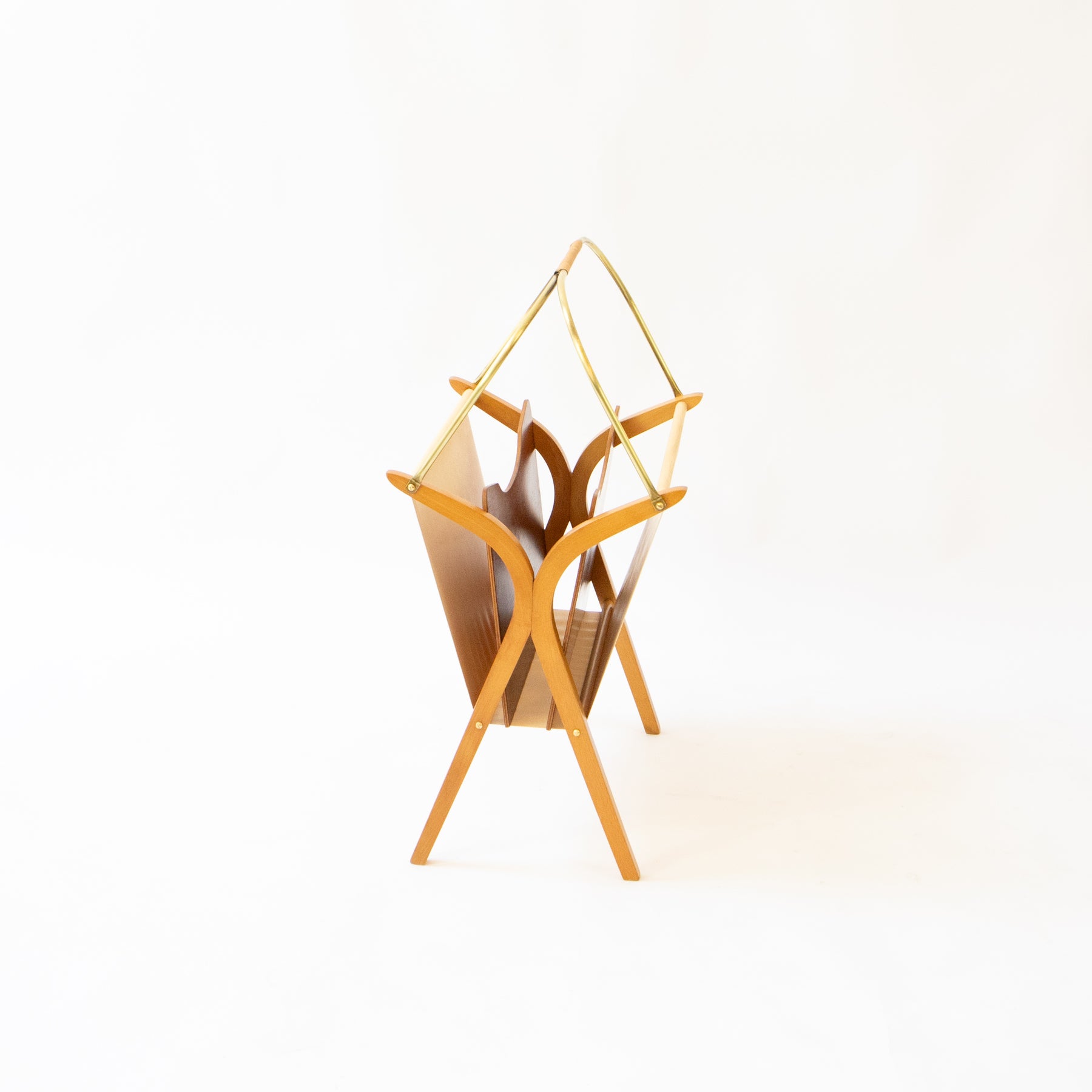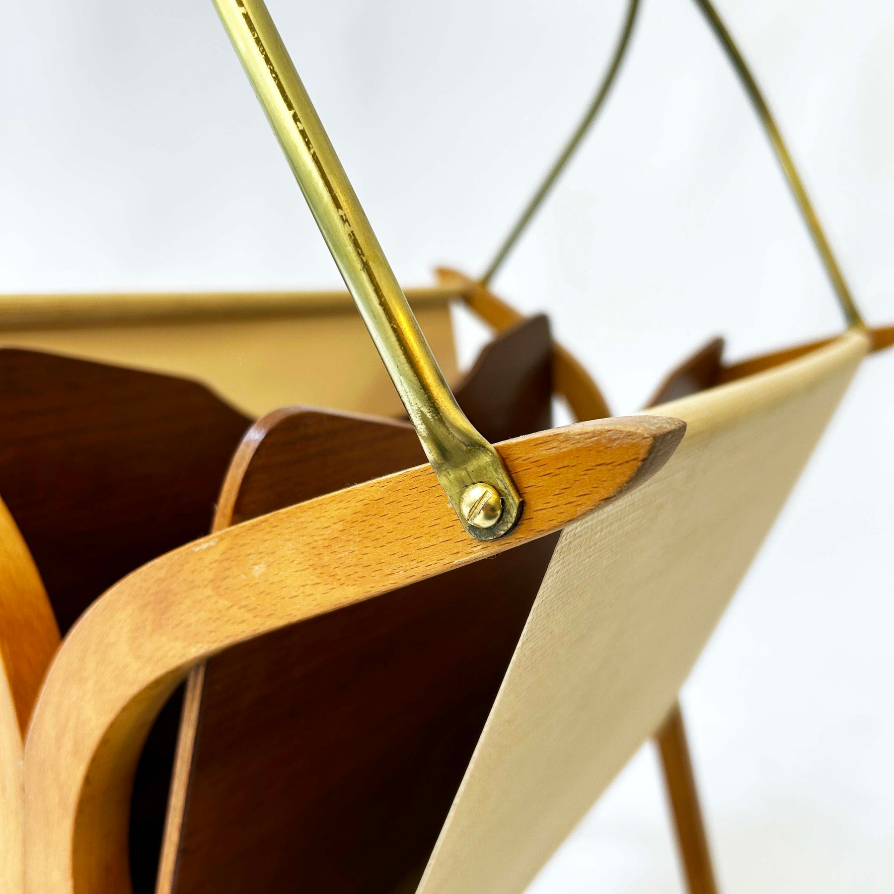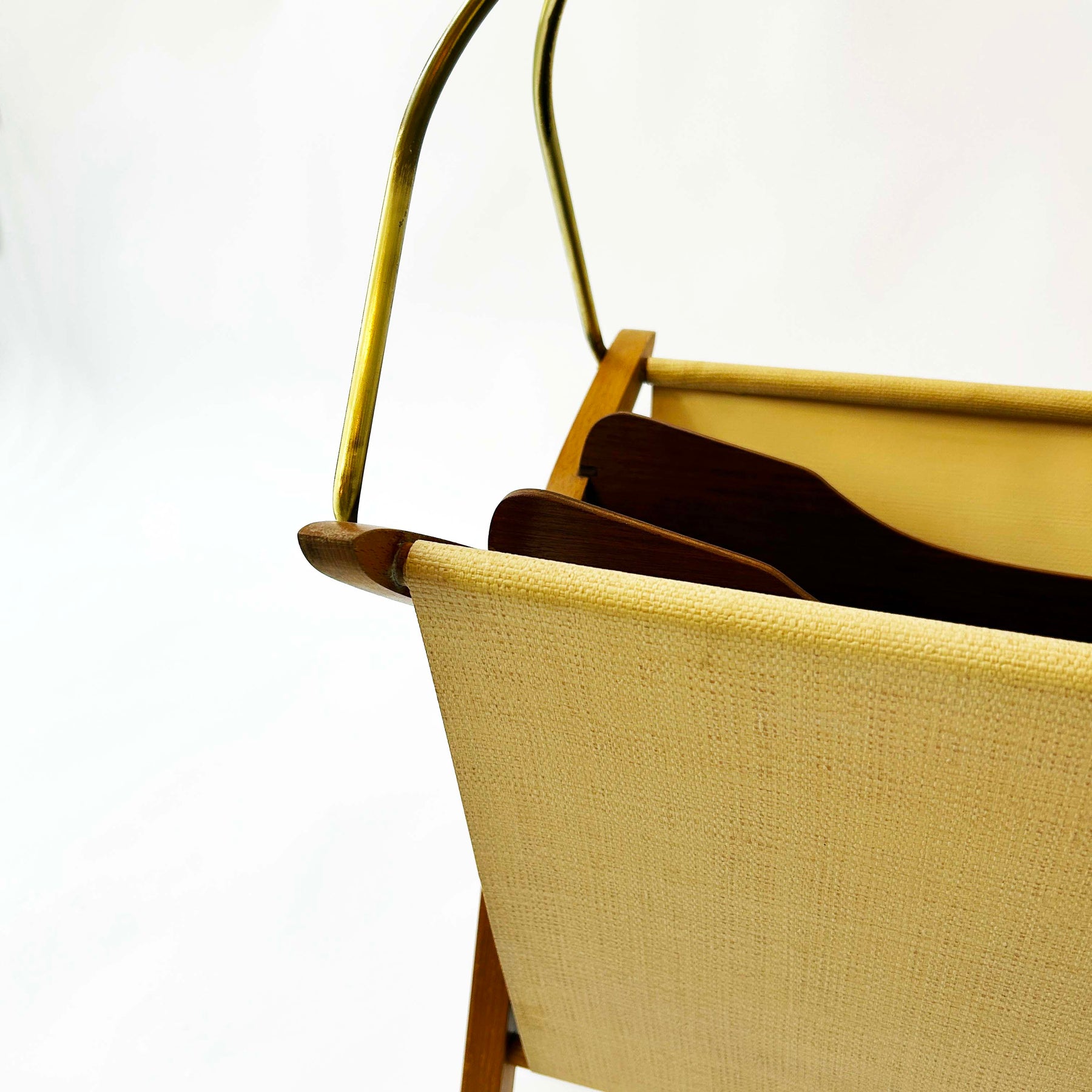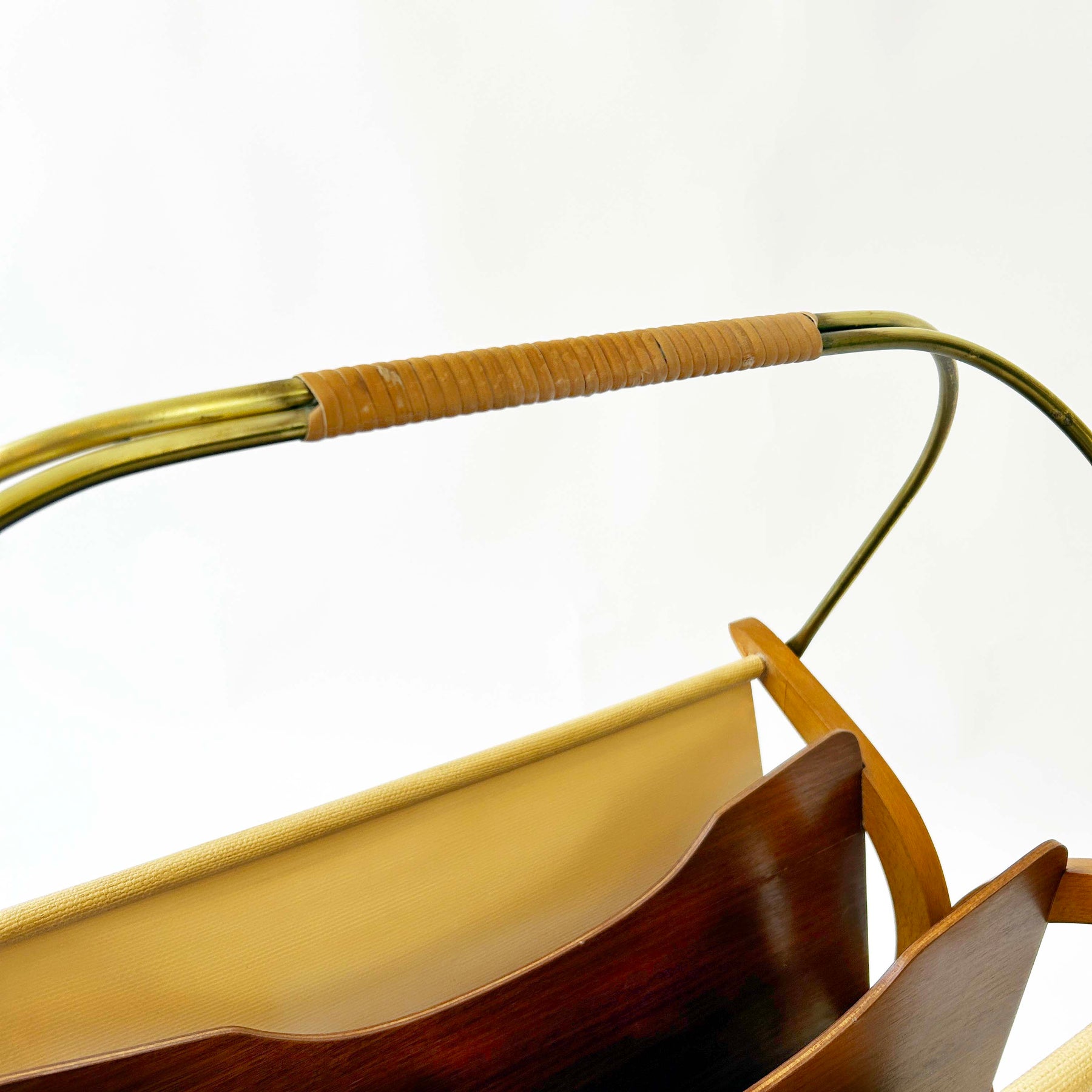 Einfach und elegant, wurde dieser Zeitungsständer um 1950 in der Tradition der Entwürfe des Atelier Auböcks geschaffen. Aus Holz, Messing und Kunststoff gefertigt, mit einem raffiniert mit Raffia umwickelten Griff, bietet dieser Zeitungsständer eine stilvolle Möglichkeit, um Zeitschriften und Zeitungen aufzubewahren.