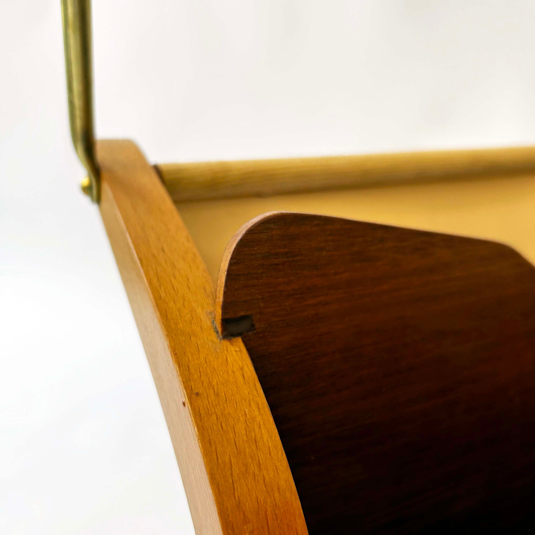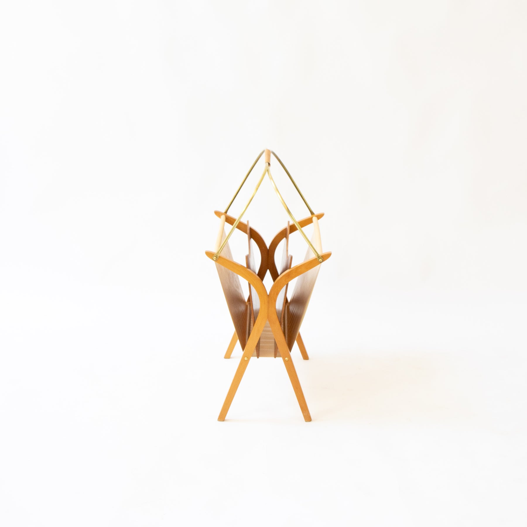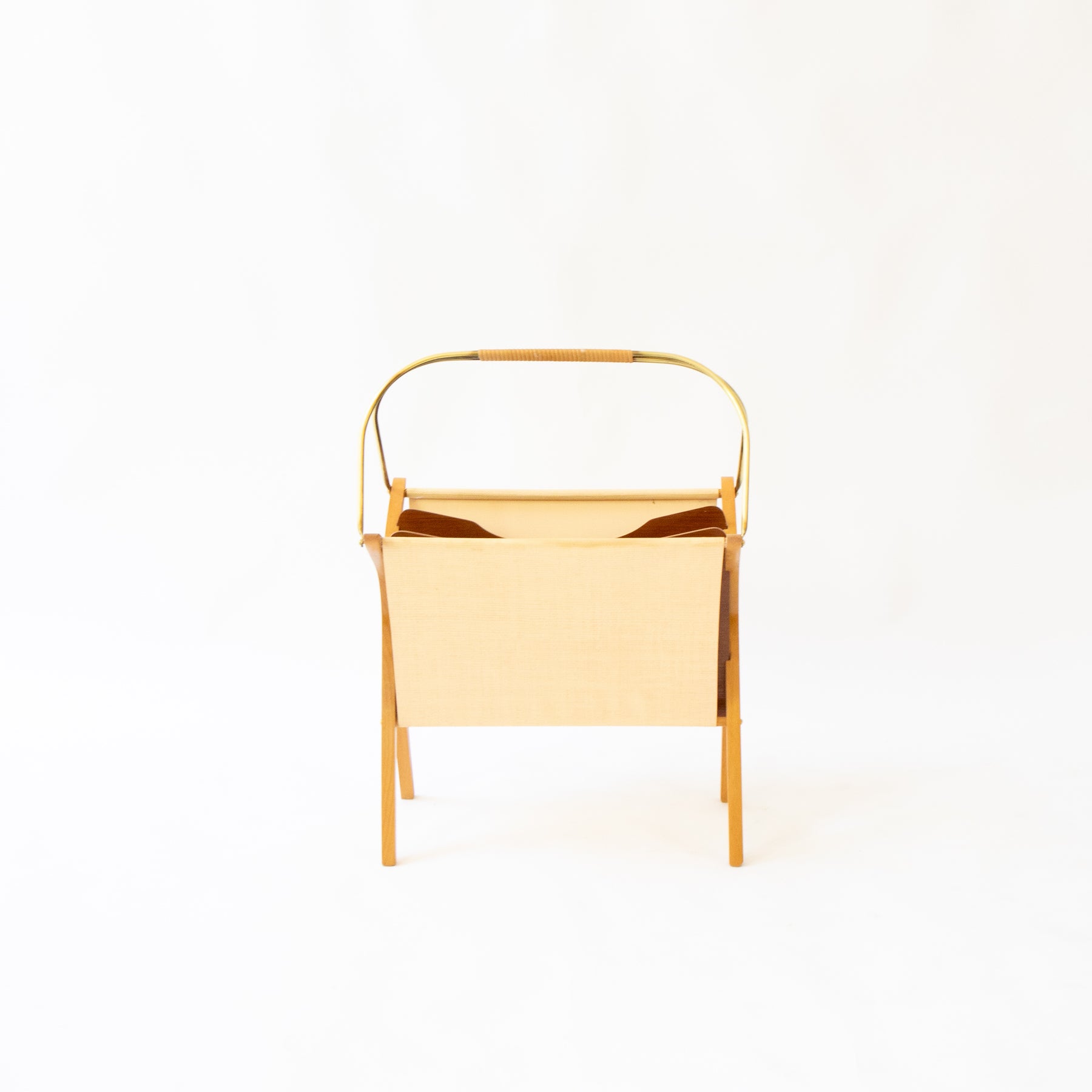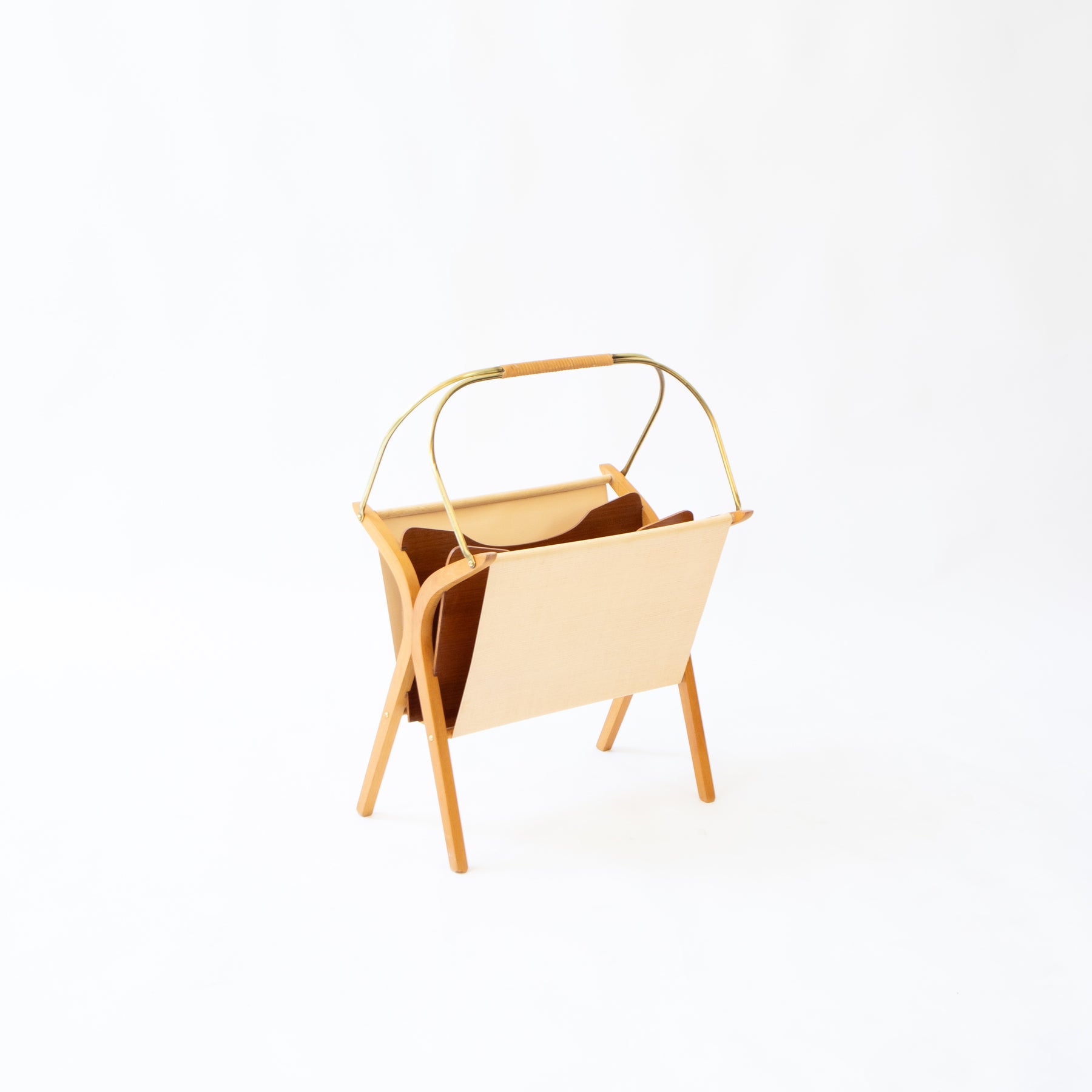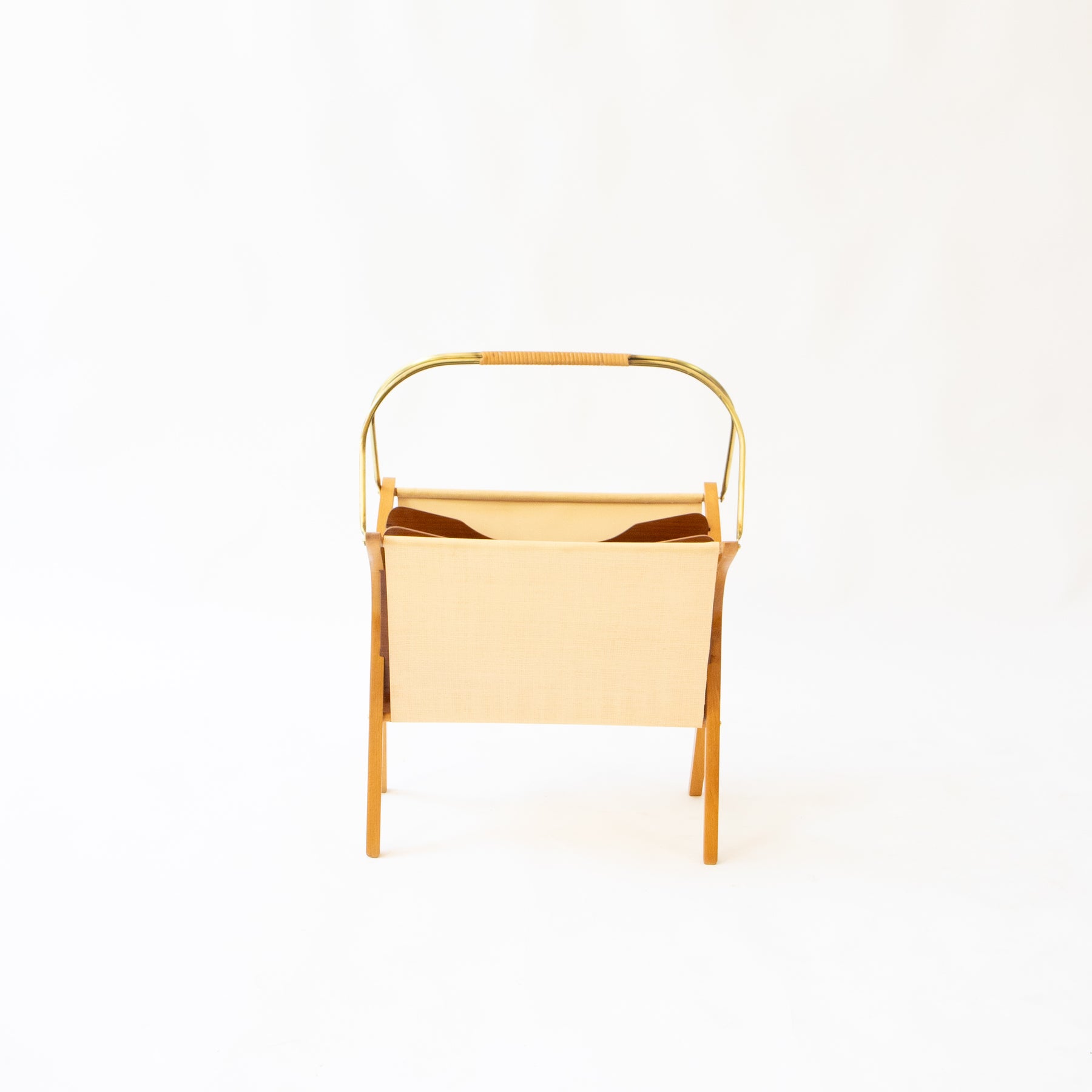 Einfach und elegant, wurde dieser Zeitungsständer um 1950 in der Tradition der Entwürfe des Atelier Auböcks geschaffen. Aus Holz, Messing und Kunststoff gefertigt, mit einem raffiniert mit Raffia umwickelten Griff, bietet dieser Zeitungsständer eine stilvolle Möglichkeit, um Zeitschriften und Zeitungen aufzubewahren.