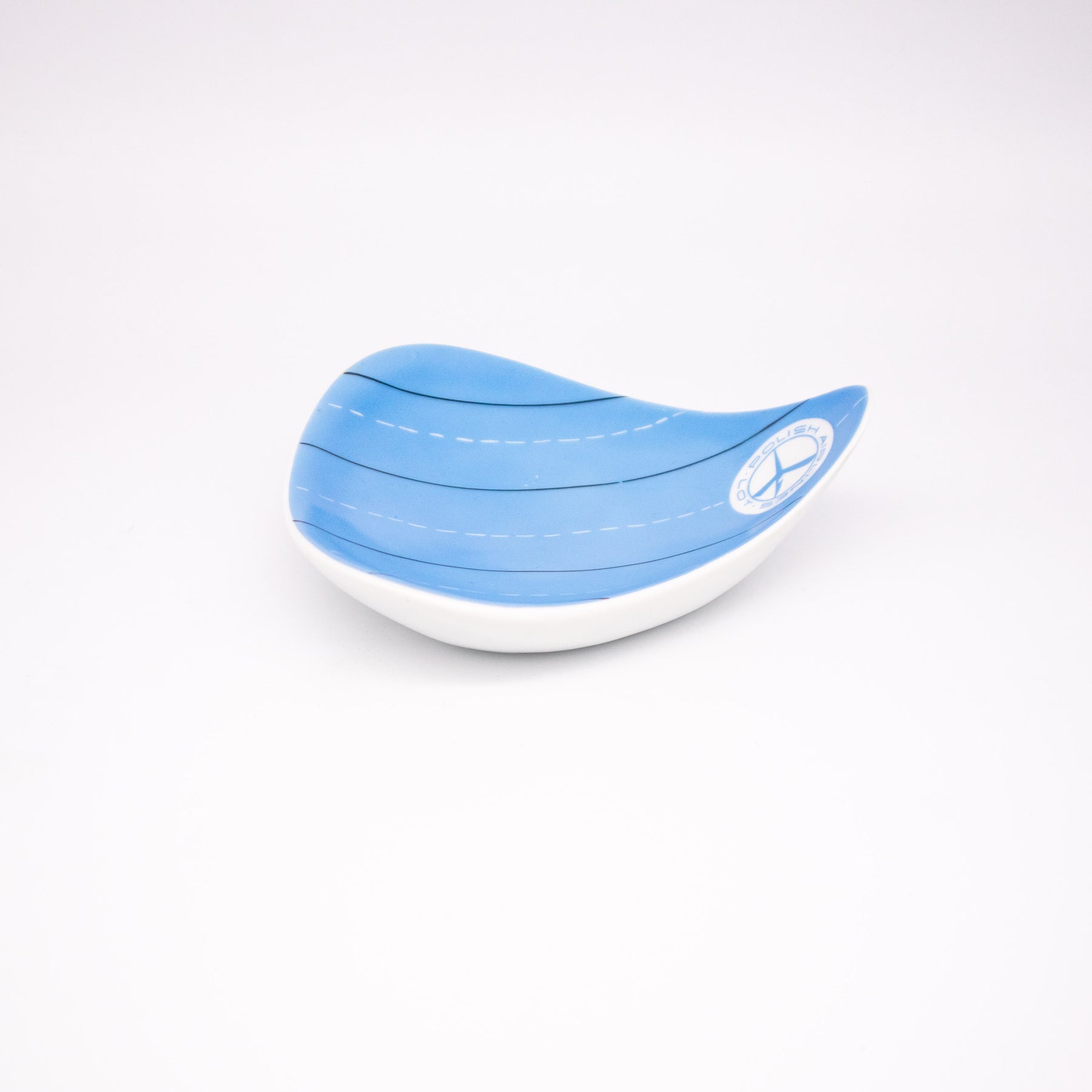 This iconic "Leaf" advertising ashtray dates back to the 1960s and was designed by renowned designer Danuta Duszniak for the Polish airline LOT. Its distinctive leaf shape and subtle light blue decor are hallmarks of modern airline design from this period. A significant collector's item for enthusiasts of vintage aviation design and Polish design history.